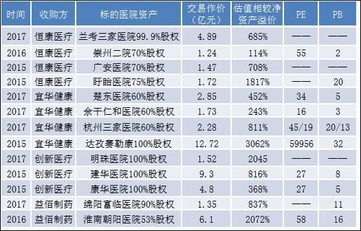 有投資人用“瘋狂”來形容這兩三年,估值泡沫也由此開始堆積。投中網(wǎng)發(fā)現(xiàn),這期間金額較大的醫(yī)院收購,標(biāo)的估值相較凈資產(chǎn)大多溢價數(shù)倍,甚至數(shù)十倍,其中益佰制藥2016年超6億元收購的淮南朝陽醫(yī)院溢價超過20倍,宜華健康2015年以近13億元收購的達(dá)孜賽勒康溢價更是超過30多倍,PE竟然高達(dá)驚人的近6萬倍。無論是從溢價率,還是從PE、PB的角度看,這三年里醫(yī)院估值泡沫明顯。