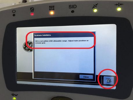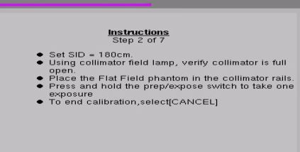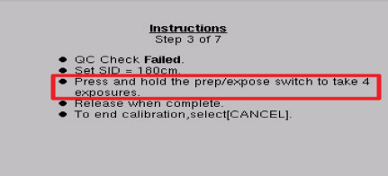 本底校準后,根據(jù)右邊方框中步驟提示:將SID設置180cm位置,放入21mm厚度的鋁,值得注意的是這個時候沒有提示要拿出濾線器,但是在球管面板上曝光會禁止,點觸摸屛,會提示濾線柵與曝光條件不符,此時拿出濾線柵即可正常曝光。板根據(jù)提示曝光一次完成該步驟。