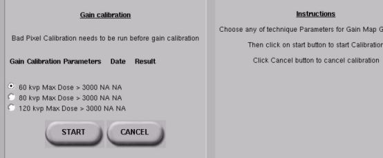 4:Gain校準,點擊進入校準程序后,會出現(xiàn)響應條件選擇,依次選60kv、80kv、120kv。根據(jù)右邊提示進行響應曝光,此時SID也是180cm,放入鋁板,去掉濾線柵。