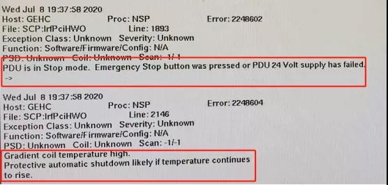 1. 首先查看log,主要報錯信息有兩條如下圖:一是PDU is in Stop mode. 二是Gradint coiltemperature high. 通過之前的分析,為了排除24V回路問題,手動按下鍵盤上的STOP鍵,磁體面板燈熄滅,在PDU按綠色復(fù)位鍵可以復(fù)位,排除24V供電問題。
