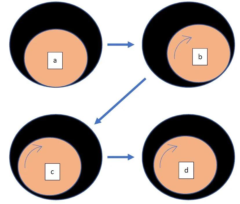 圖3 液態(tài)金屬軸承啟動過程中的轉(zhuǎn)軸和軸瓦的位置關(guān)系示意