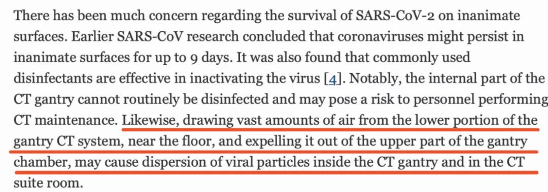 翻譯:研究人員指出,CT機(jī)架的內(nèi)部無法常規(guī)消毒,這可能對(duì)CT的操作人員造成風(fēng)險(xiǎn)。同時(shí),當(dāng)CT系統(tǒng)從底部吸入大量空氣并排出后,可能會(huì)導(dǎo)致病毒顆粒在CT內(nèi)部和CT檢查室內(nèi)擴(kuò)散 。