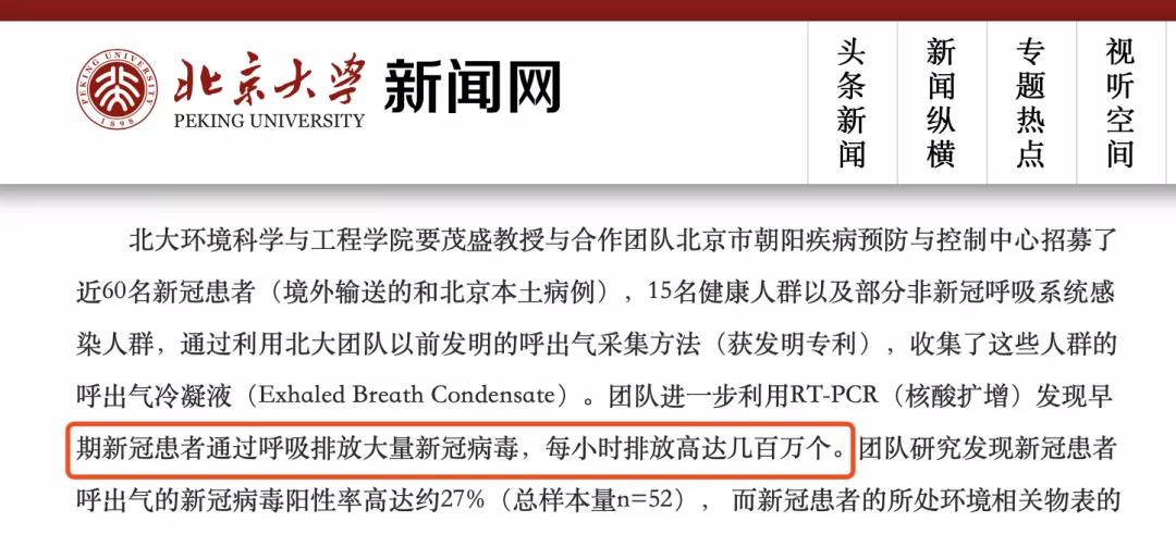 北京大學(xué)最新研究發(fā)現(xiàn):新冠肺炎早起患者,每小時(shí)呼出上百萬個(gè)新冠病毒