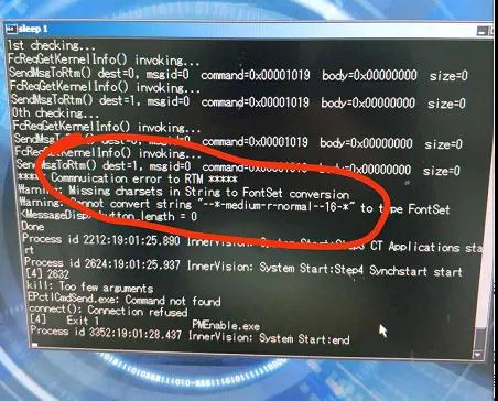 3)檢查操作臺(tái)主機(jī)柜前面通訊接口板SSADI上晶振電池情況,其中一塊電池輸出為0,更換后故障還是一樣,未解決。4)按CTRL+ALT+A查看sleep1中的APP啟動(dòng)過(guò)程,發(fā)現(xiàn)仍然提示與RTM通訊ERROR,開(kāi)始檢查重建柜內(nèi)各板指示燈狀態(tài),未見(jiàn)明顯異常情況。
