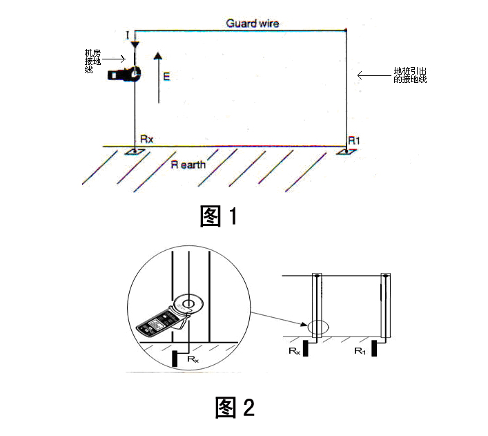 1、如果以機(jī)房為中心的半徑10米范圍內(nèi)沒(méi)有用作檢測(cè)的輔助接地裝置,則需在原機(jī)房接地裝置的1平方米面積中再次打入一根深度不小于1.0——1.5米的地樁作為檢測(cè)回路的輔助接地端。再?gòu)钠涞貥渡弦鲆桓孛娣e不小于16平方毫米的黃綠銅質(zhì)接地線與機(jī)房原接地相連形成檢測(cè)回路(如圖1所示)。打開(kāi)鉗型接地電阻測(cè)試儀,切換到電阻測(cè)量功能,將儀器套住機(jī)房接地線端(如圖2所示),即可測(cè)得機(jī)房的接地電阻阻值Rx。按要求,所測(cè)得的接地電阻阻值應(yīng)不大于4歐姆。同理將測(cè)試儀套住獨(dú)立接地裝置引出的黃綠接地線,可測(cè)得輔助接地裝置的接地電阻阻值R1。