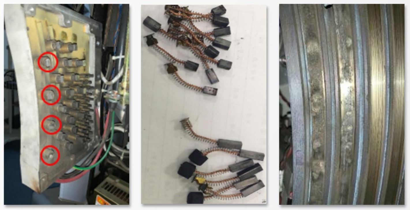 這些故障中, 有些是因為電路器件意外失效所導(dǎo)致, 但更常見的是由于滑環(huán)環(huán)面及刷組沒有定期檢查清理、碳粉積累嚴重、環(huán)面和刷頭磨損過重所導(dǎo)致。