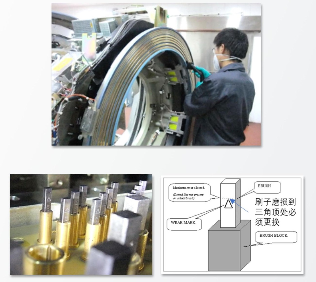 CT滑環(huán)組件是通過刷頭和環(huán)面的接觸來傳輸電能和控制信號的。由于用彈簧壓緊的刷頭與轉(zhuǎn)動的環(huán)面之間存在摩擦,使用過程中刷頭磨損產(chǎn)生的碳粉碎屑在環(huán)面越積越多。所以滑環(huán)的定期清理和檢查,及對磨損到標記線的刷頭及時更換,對CT機的穩(wěn)定運行非常重要。