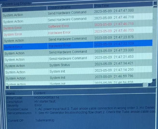 在設(shè)備日志文件中檢測到錯(cuò)誤:“硬件錯(cuò)誤 HG000A0R06114”。嘗試預(yù)熱射線管后會出現(xiàn)此錯(cuò)誤,表明設(shè)備的高壓部分(發(fā)生器、逆變器、X 射線管)出現(xiàn)故障。