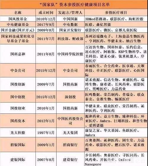 除了社會資本,“國家隊(duì)”資本也積極布局醫(yī)療健康領(lǐng)域投資,對醫(yī)健領(lǐng)域投資生態(tài)有重要影響。此“國家隊(duì)”主要包括國資委、各部委及直屬機(jī)構(gòu)、央企等參與出資組建的公司,以及個地方政府組建的政府引導(dǎo)基金和產(chǎn)業(yè)專項(xiàng)基金。從其投資布局可以解讀出產(chǎn)業(yè)發(fā)展的風(fēng)向,以及產(chǎn)業(yè)規(guī)劃的重點(diǎn)。